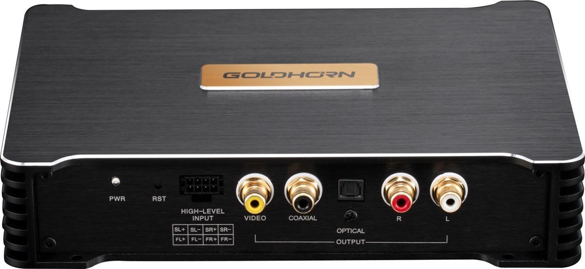 На передней панели GoldHorn P3 Plus расположены 2 х RCA-выхода, разъемы цифровых аудио выходов Toslink и Coax, разъем для подключения внешнего монитора и разъем для подключения Hi-Level входов. На задней панели расположены 3 разъема USB-A для подключения внешнего накопителя и опционального пульта ДУ с IPS дисплеем и энкодером, разъем для интерфейса согласования с рулевыми кнопками, разъем для подключения питания и mini USB для обновления ПО. Для внешних антенн Bluetooth и Wi-Fi предусмотрены отельные терминалы.