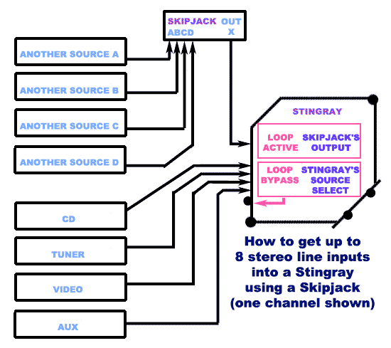 А что будет, если вы захотите добавить, например, функцию обхода домашнего кинотеатра* к вашему основному стерео-предусилителю? Если вы задействуете режим 3 х 2, в котором «D» становится другим выходом, вы можете использовать любой из трех источников (A-B-C) либо для управления выходом «D», который может быть вашим предусилителем для обычного стерео воспроизведения, либо выходом «X», который может быть вашим процессором объемного звука для многоканального воспроизведения. Вы можете использовать еще один SKIPJACK для совместной работы со входами L и R ваших основных двухканальных усилителей и выбрать либо выходы L&R вашего стерео-предусилителя, либо основные выходы L&R вашего процессора объемного звука! Используйте пульт дистанционного управления на обоих SKIPJACK, чтобы соединить их для одновременного переключения! Или используйте дополнительный беспроводной пульт. *Обход домашнего кинотеатра – это функция, которую можно найти в интегрированных усилителях высокого класса, используемых в системах домашнего кинотеатра. Он используется для подключения внешней двухканальной стереосистемы к системе домашнего кинотеатра с объемным звучанием через RCA. Эта функция позволяет обойти всю сложную цифровую обработку интегрированного усилителя.