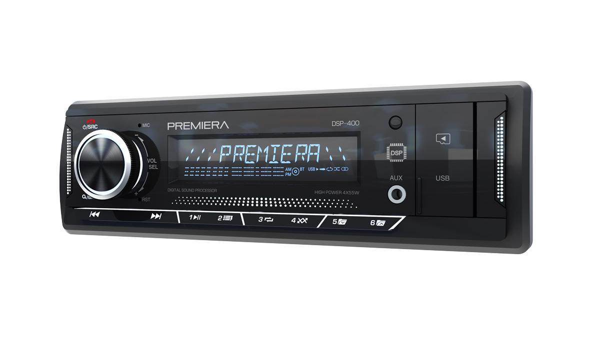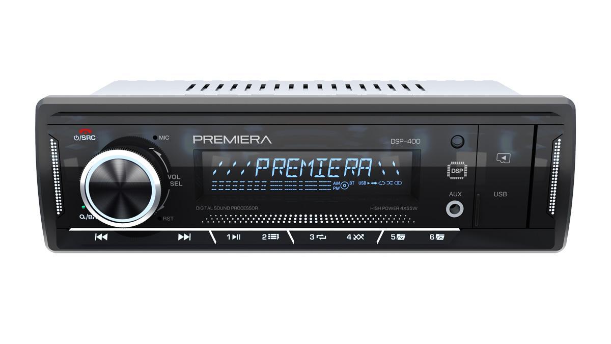 PREMIERA DSP-400 - FM/USB/SD ресивер с Bluetooth и DSP - процессором, стандартного размера 1DIN, который обеспечивает прием радиостанций в диапазоне FM, воспроизведение медиафайлов MP3, WAV, и FLAC форматов, записанных на карты памяти USB / microSDXC, передачу звука с внешних источников, а также управление мобильным телефоном через интерфейс Bluetooth Hands-Free. Передняя панель автомагнитолы несъёмная, многоцветная подсветка кнопок.