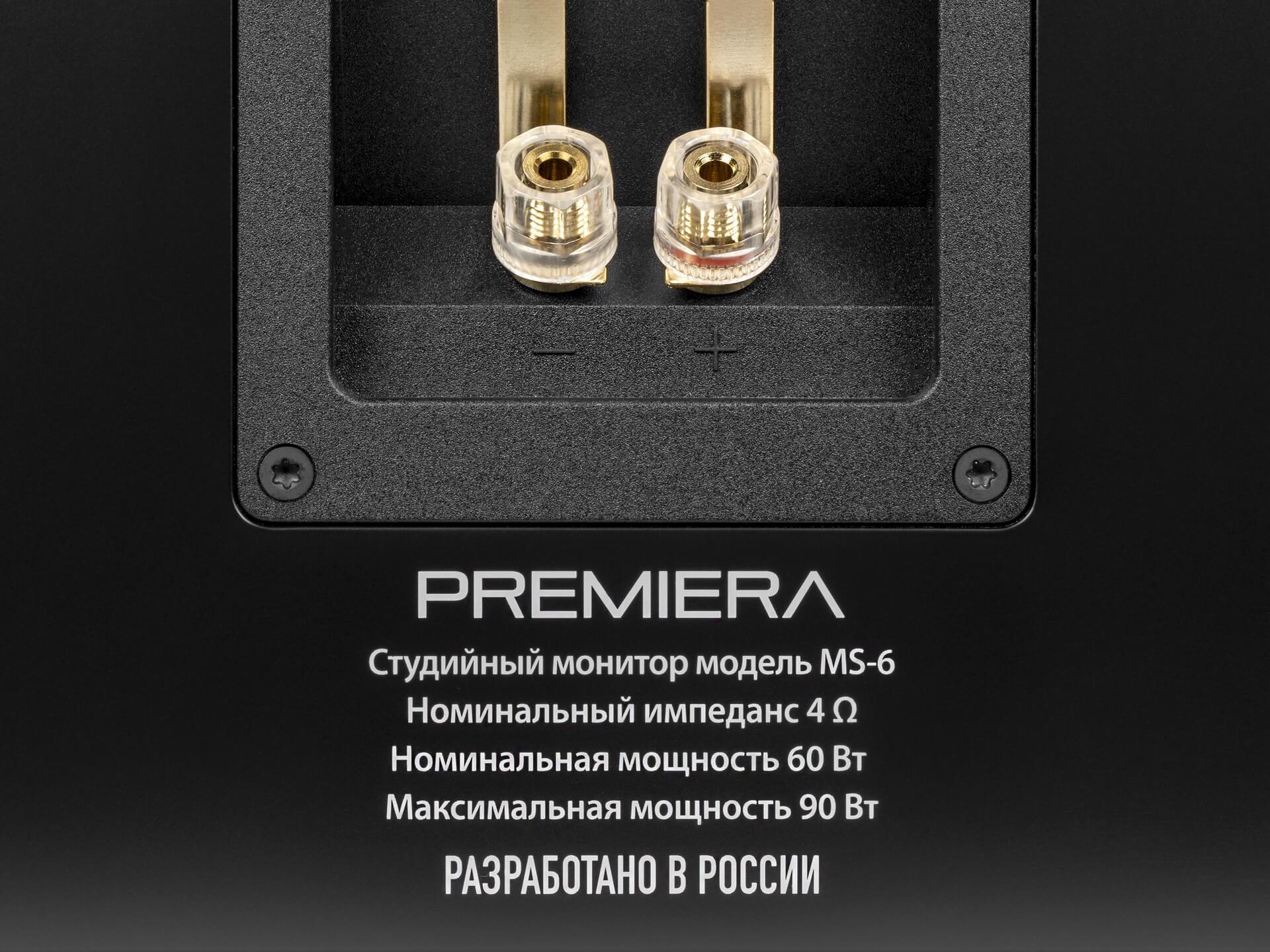 Premiera MS-6 «Studio 6» - полочные профессиональные акустические системы мониторного класса с феноменальной равномерностью звучания практически во всём диапазоне громкости. «Studio 6» предназначенные для использования в студиях звукозаписи, в качественных Hi-Fi-стереосистемах и в многоканальных системах домашнего кинотеатра любых конфигураций.