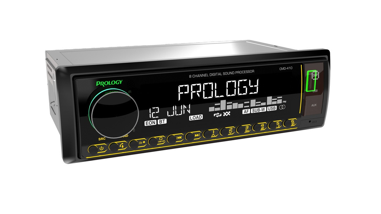 PROLOGY CMD-410 – FM/USB ресивер с Bluetooth® и встроенным 8-канальным аудиопроцессором ULTRA DSP, стандартного размера 1DIN, который обеспечивает прием радиостанций в диапазонах FM/УКВ/AM и воспроизведение аудиофайлов MP3, WAV, и FLAC форматов, записанных на USB-накопители, передачу звука с внешних источников через линейный аудиовход и беспроводной интерфейс Bluetooth. Поддерживается управление мобильным телефоном через интерфейс Bluetooth® (ver. 5.1). Устройством можно управлять при помощи мобильного приложения Prology Audio, установленного на смартфон с операционной системой Android или iOS.