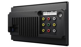 Питание и акустика подключаются входящим в комплект переходным кабелем ISO. Разъёмы RCA — линейные выходы фронтальных каналов, линейный выход на сабвуфер, AV-вход, входы для двух камер и видеовыход для внешнего монитора. К правому из белых разъёмов подключается кабель сопряжения с кнопками на руле, рядом — антенна и вход внешнего микрофона (приобретается отдельно)